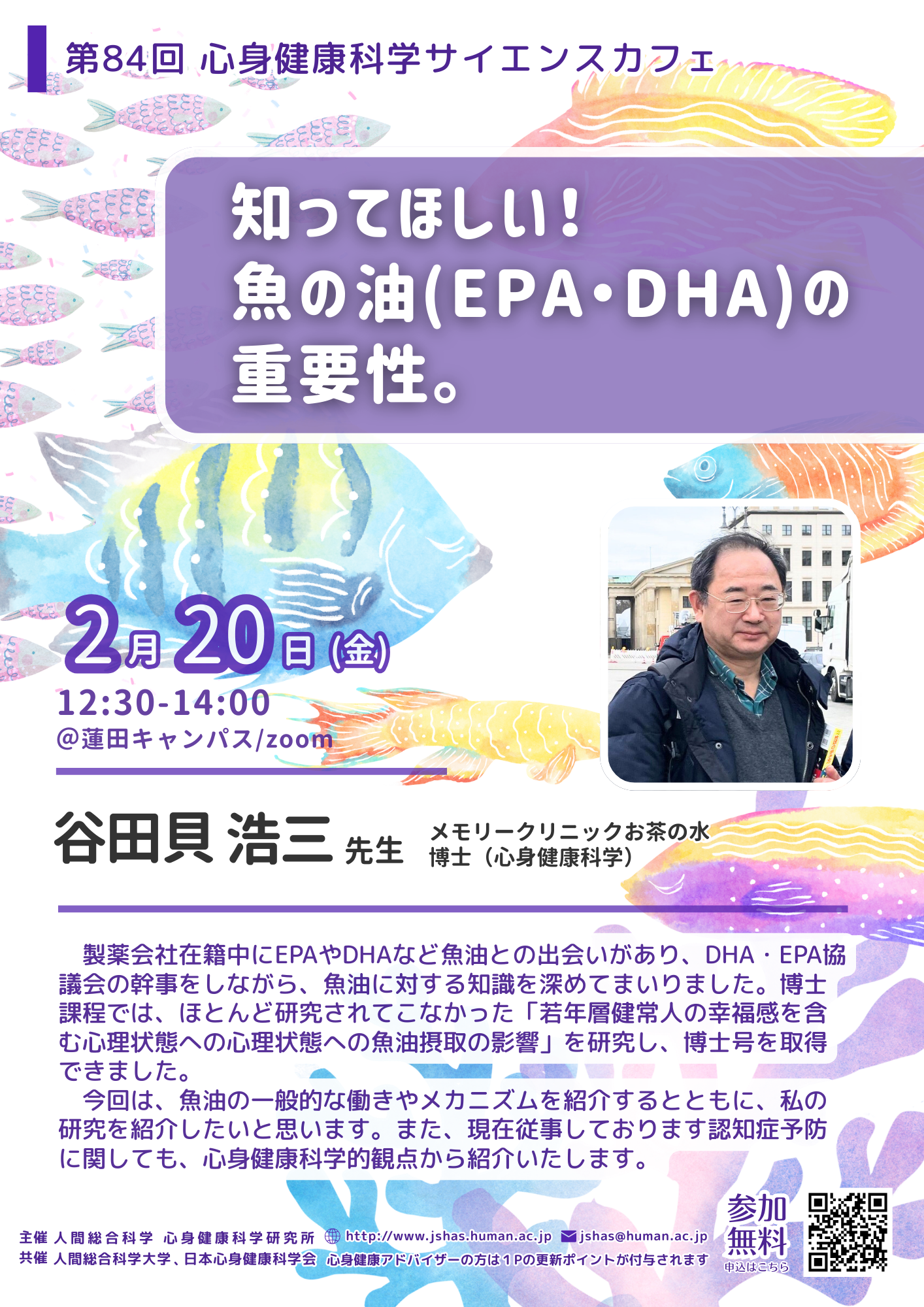 今回は、魚油の一般的な働きやメカニズムを紹介するとともに、私の研究を紹介したいと思います。また、現在従事しております認知症予防に関しても、心身健康科学的観点から紹介いたします。