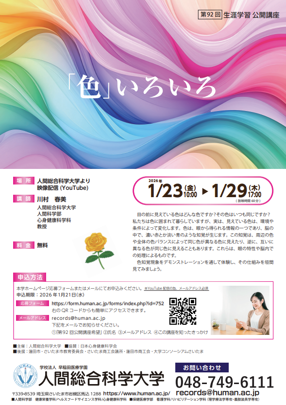今回のテーマは「『色』いろいろ」で、講師は川村 晴美(人間総合科学大学 人間科学部 心身健康科学科 教授)です。