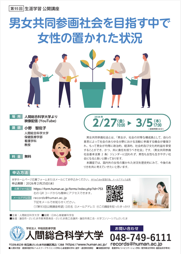 今回のテーマは「男女共同参画社会を目指す中で女性の置かれた状況」で、講師は小野 智佐子(人間総合科学大学 保健医療学部 看護学科 教授)です。